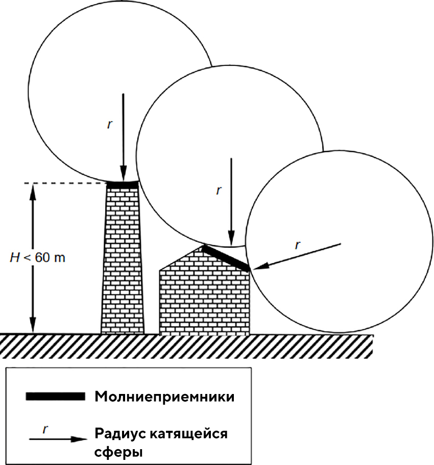 Его суть: расположение молниеприёмников обеспечивает зону защиты в том случае, если ни одна из точек защищаемого сооружения не соприкасается с условной сферой радиусом r, катящейся вокруг и по верхней части сооружения во всех возможных направлениях. Радиус сферы зависит от класса системы молниезащиты, который определяют на начальном этапе проектирования в соответствии с ГОСТ Р МЭК 62305-2-2010. Объект считается защищённым от прямых ударов молнии, если сфера касается только молниеприёмников, но не самого объекта (см. рисунок 1).