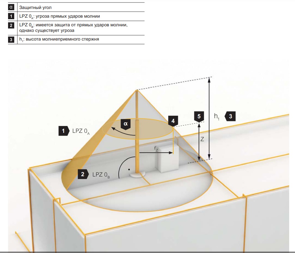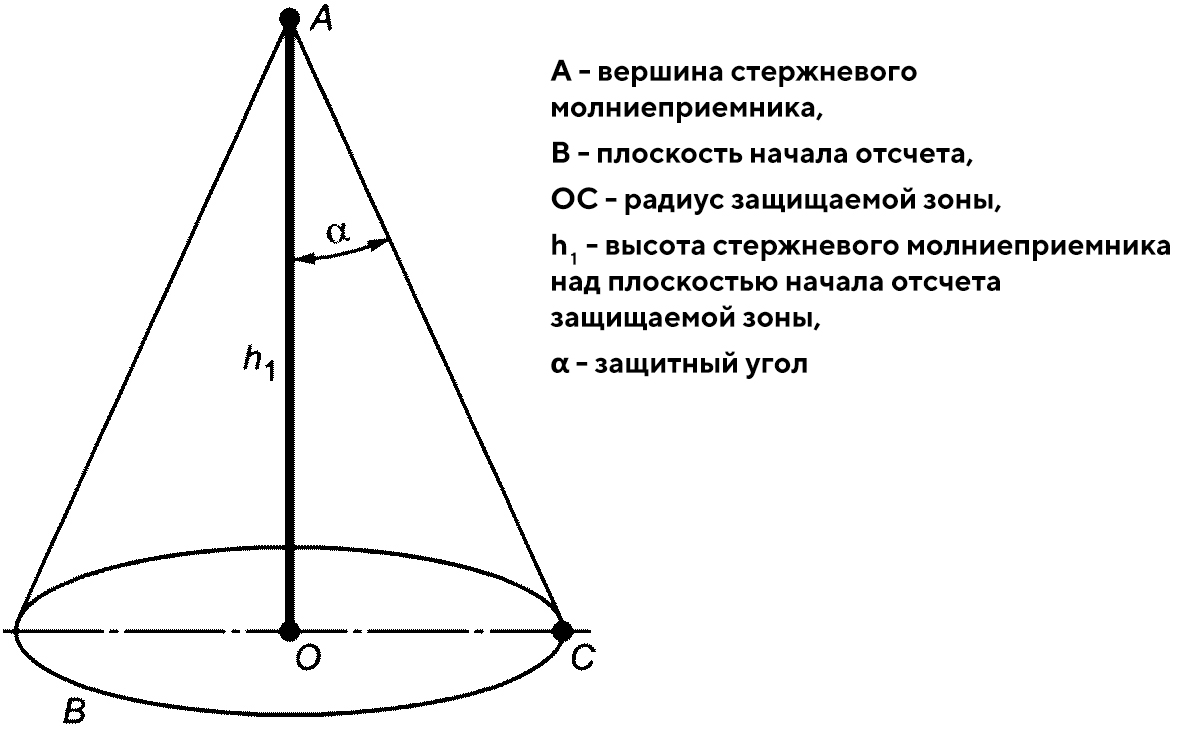 Его используют для сооружений простой формы. Условно считается, что объем, защищаемый стержневым молниеприёмником, имеет форму правильного конуса с вершиной на оси молниеприёмника и защитным углом α, равным половине угла раствора конуса (рисунок 2). Защитный угол зависит от класса системы молниезащиты.