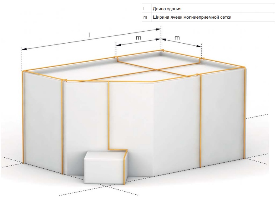 Схематичное изображение сетки на здании с плоской кровлей вы видите на рисунке 4. Для кровли с уклоном более 1/10 верхний проводник прокладывают по коньку. В свою очередь, от него идут параллельные проводники по скатам с шагом, не превышающим ширину ячеек молниеприёмной сетки. Проводники сетки нужно прокладывать по наиболее коротким и прямым трассам. Также следует обеспечить минимум два различных металлических проводника (токоотвода), соединяющих молниеприёмную сетку с заземляющим устройством.