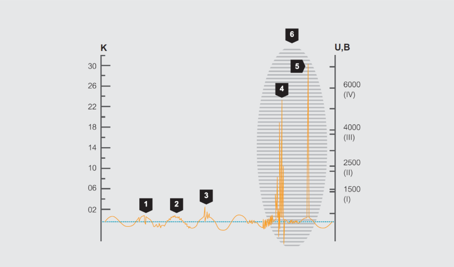 Перенапряжение, превышающее значение номинальной импульсной прочности электрооборудования, приводит к повреждениям, вплоть до полного разрушения. Помимо мощных атмосферных перенапряжений, оборудование подвергается воздействию слабых перенапряжений, вызванных высокочастотными помехами и сетевыми авариями. Для их подавления требуется установка сетевых фильтров или устранение источников помех.