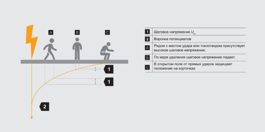 3. Шаговое напряжение - при ударе в землю ток молнии растекается, создавая разность потенциалов на поверхности. Если в этой зоне окажется человек или животное, то удара током не избежать (см. рисунок 1).