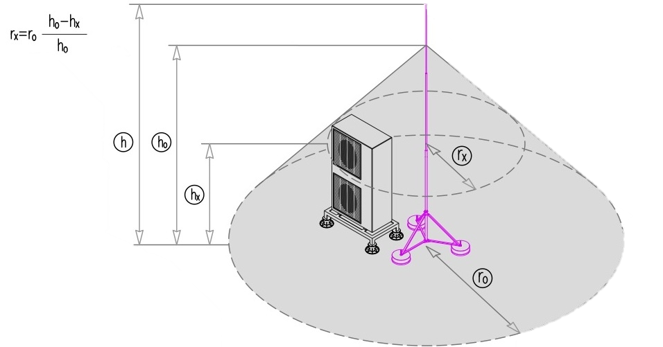 Необходимо подобрать высоту и разместить молниеприёмники так, чтобы защищаемый объект полностью находился в пределах зоны защиты. Например, согласно СО для одиночного стержневого молниеприёмника высотой h радиус горизонтального сечения rx на высоте hx рассчитывается по формуле: