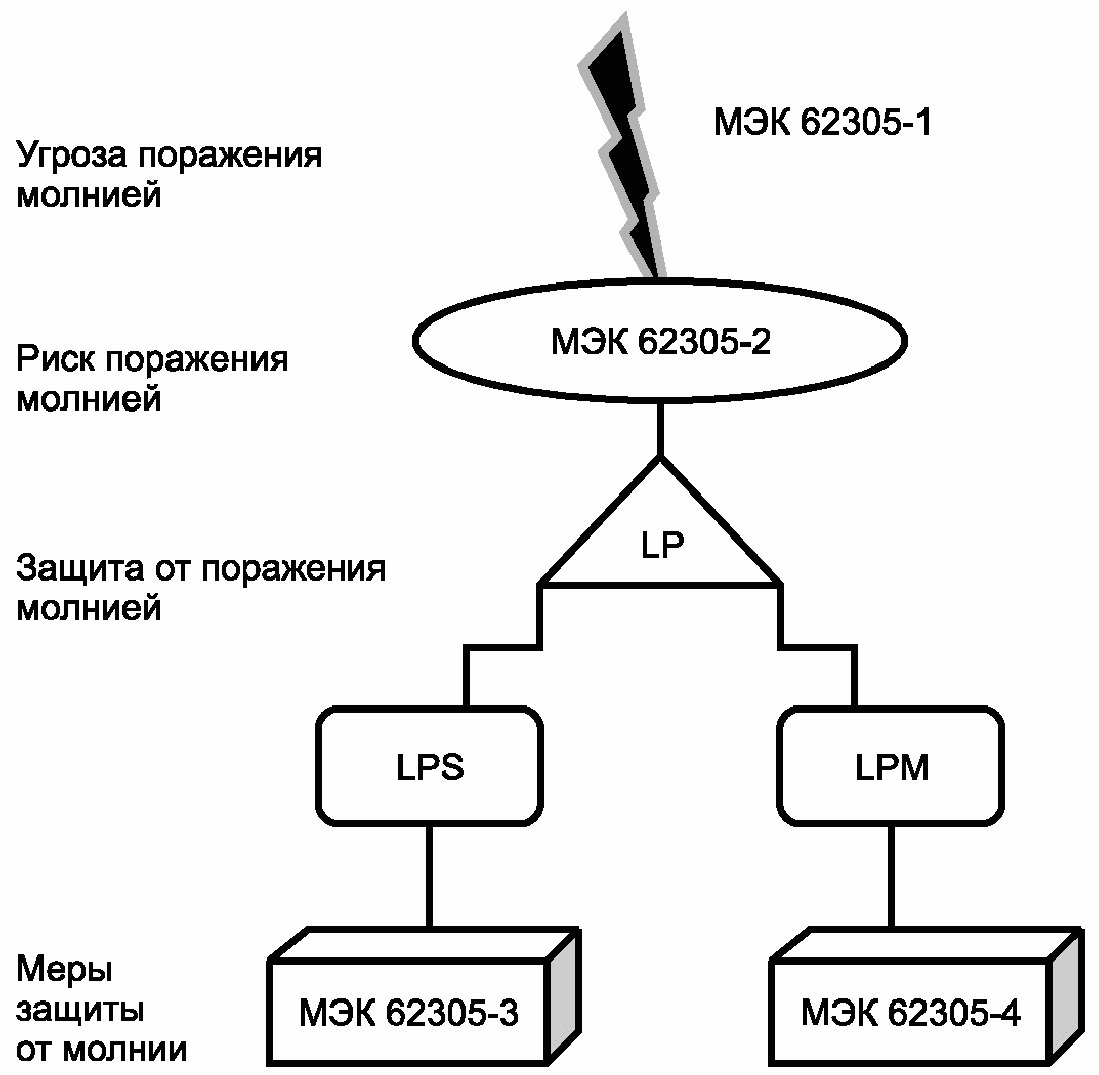 Взаимосвязь между стандартами серии ГОСТ Р МЭК 62305 показана на рисунке ниже: